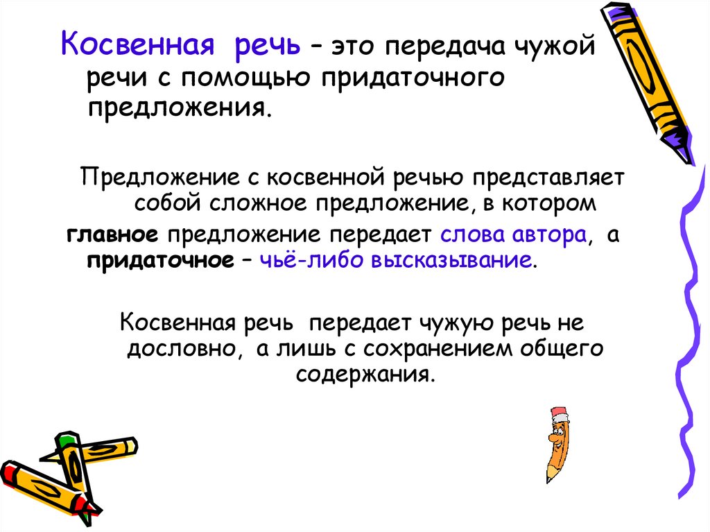 Косвенная речь – это передача чужойречи с помощью придаточного
