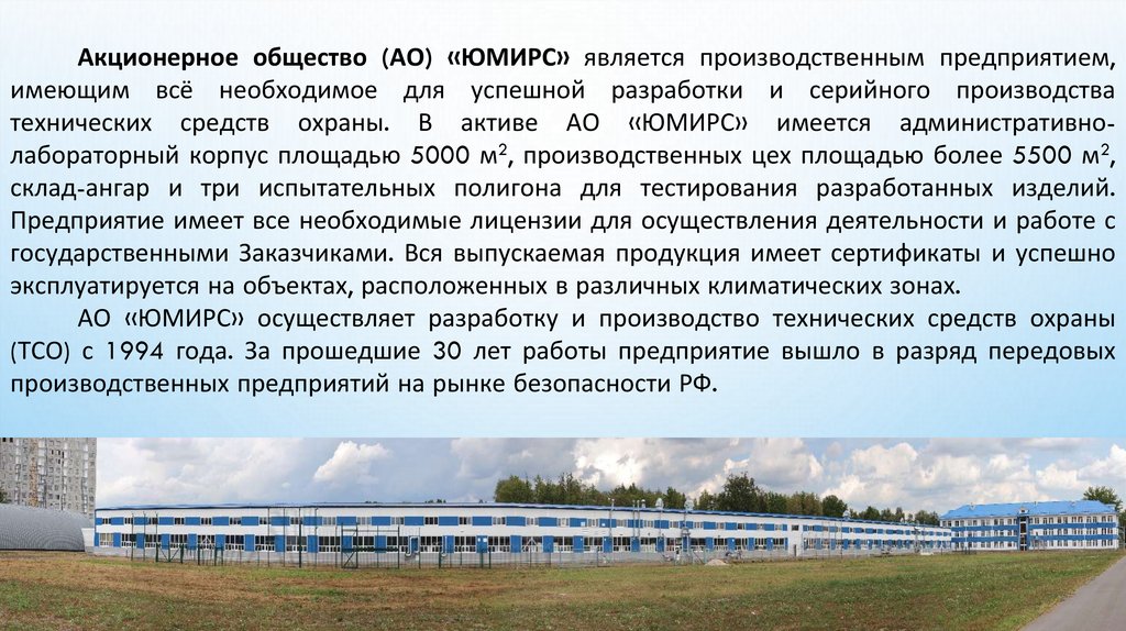 технических средств охраны. В активе АО «ЮМИРС» имеется административнолабораторный корпус площадью 5000 м2, производственных цех площадью более 5500 м2,