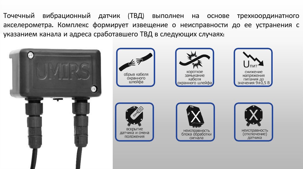 Точечный вибрационный датчик (ТВД) выполнен на основе трехкоординатногоакселерометра. Комплекс формирует извещение о неисправности до ее устранения с