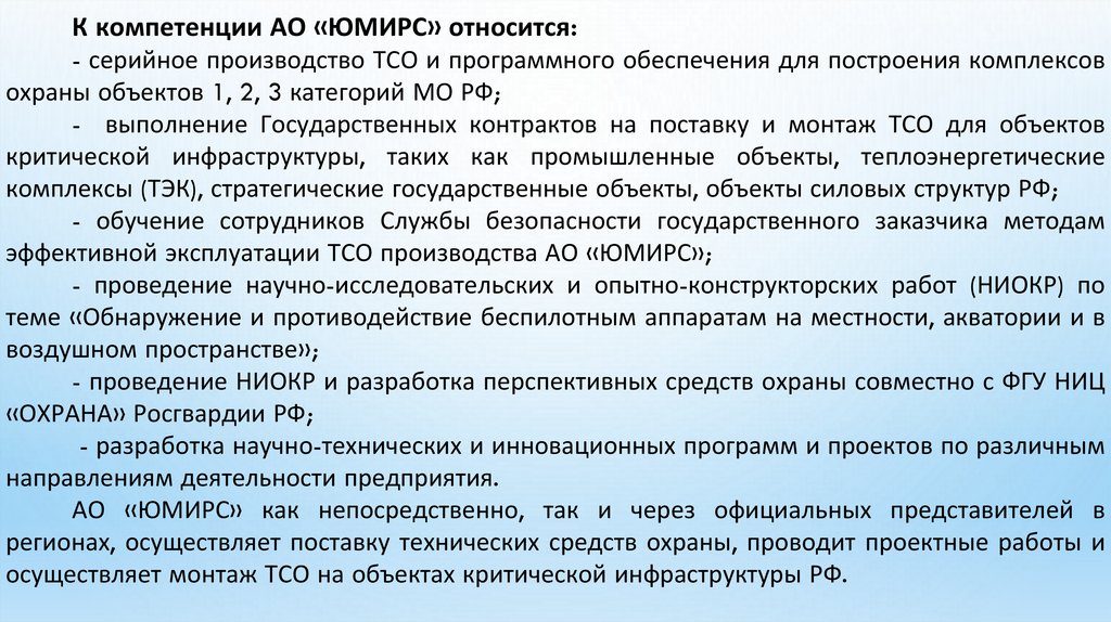 К компетенции АО «ЮМИРС» относится:- серийное производство ТСО и программного обеспечения для построения комплексов