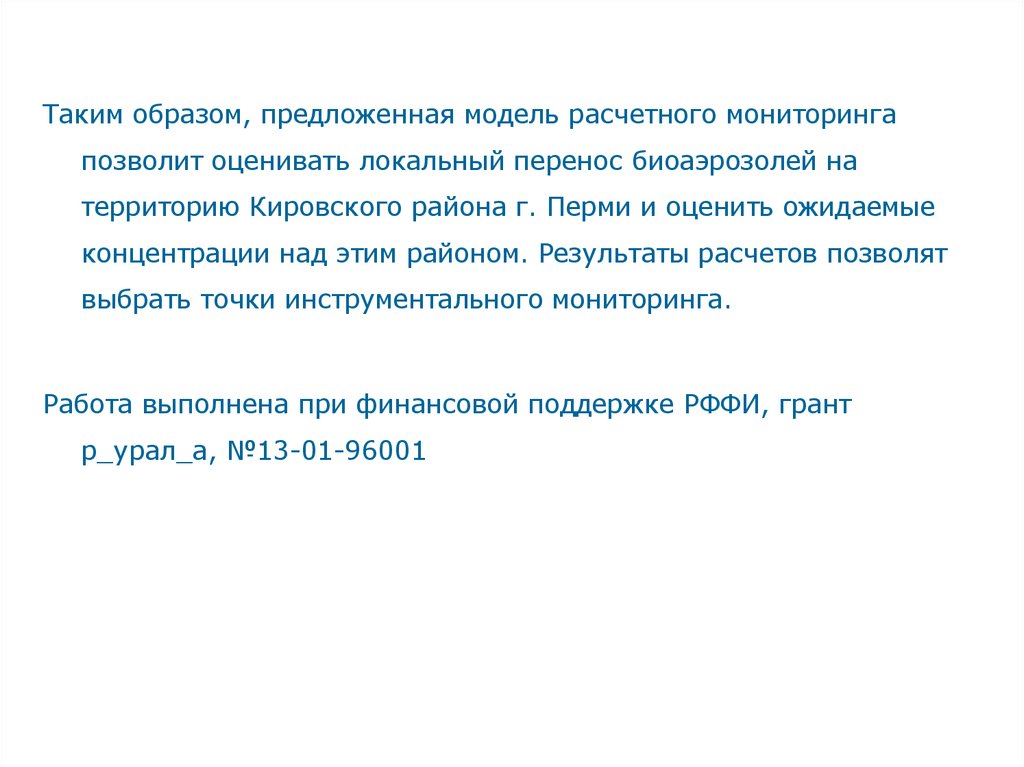 Таким образом, предложенная модель расчетного мониторингапозволит оценивать локальный перенос биоаэрозолей на