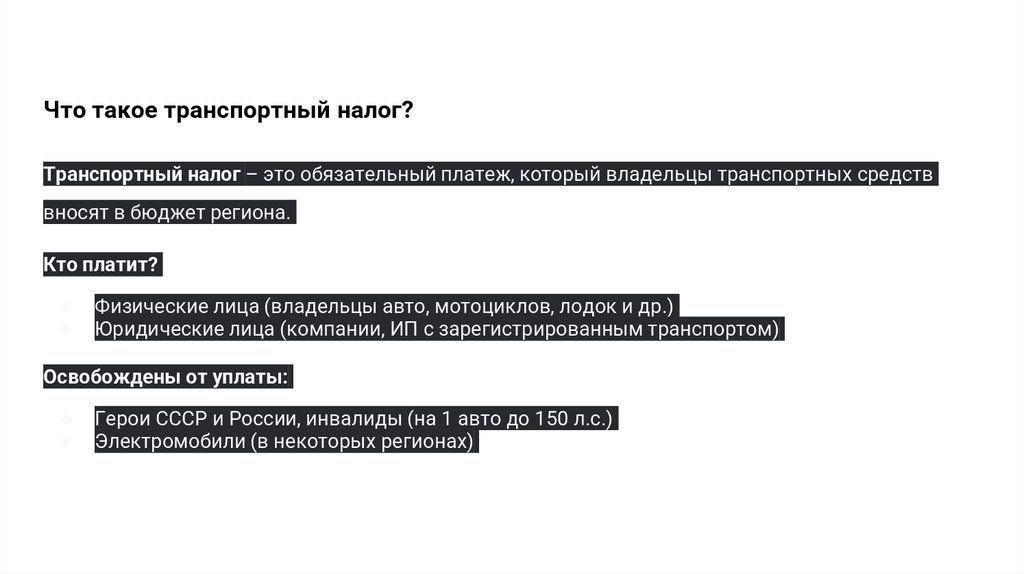 Что такое транспортный налог?Транспортный налог – это обязательный платеж, который владельцы транспортных средств