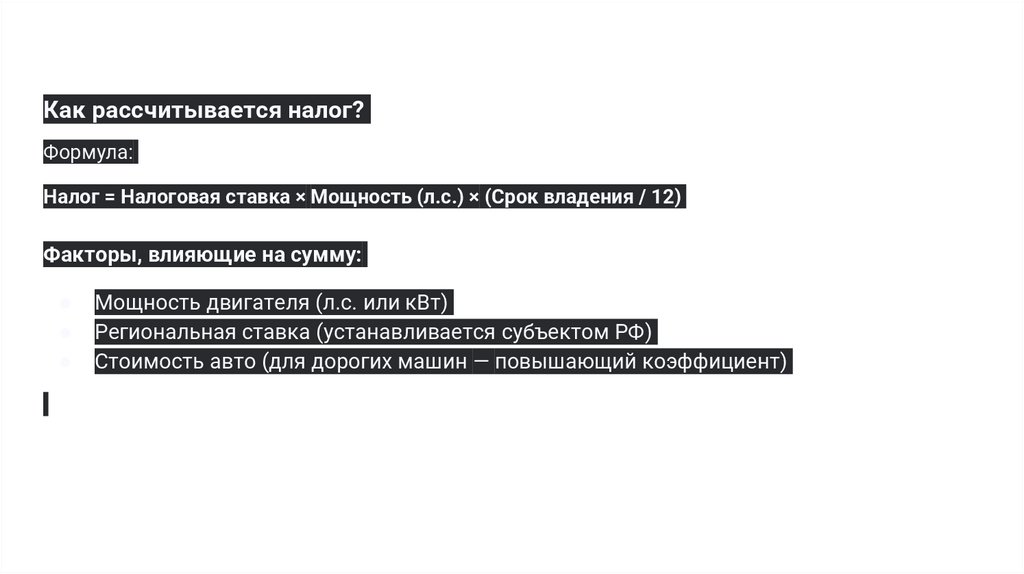 Налог = Налоговая ставка × Мощность (л.с.) × (Срок владения / 12)