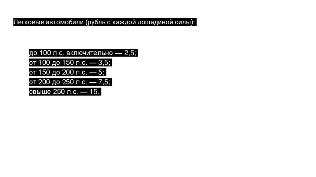 Легковые автомобили (рубль с каждой лошадиной силы):до 100 л.с. включительно — 2,5;