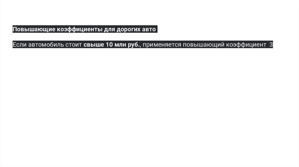 Повышающие коэффициенты для дорогих автоЕсли автомобиль стоит свыше 10 млн руб., применяется повышающий коэффициент 3