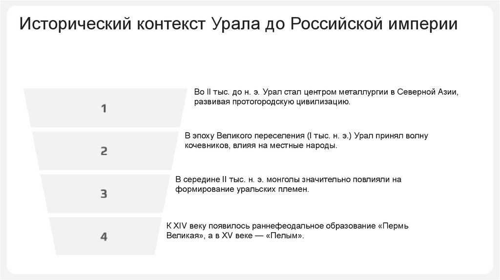 Исторический контекст Урала до Российской империиВо II тыс. до н. э. Урал стал центром металлургии в Северной Азии,