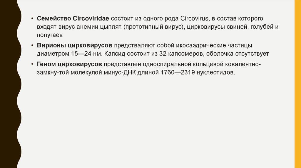 • Семейство Circoviridae состоит из одного рода Circovirus, в состав котороговходят вирус анемии цыплят (прототипный вирус), цирковирусы свиней, голубей и