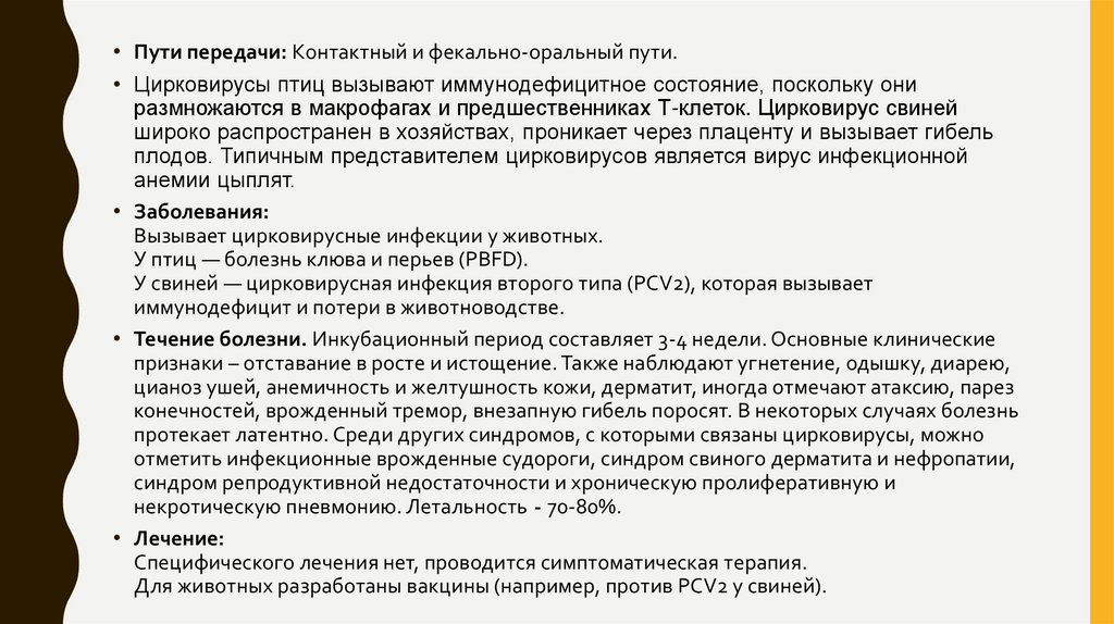 • Пути передачи: Контактный и фекально-оральный пути.• Цирковирусы птиц вызывают иммунодефицитное состояние, поскольку они