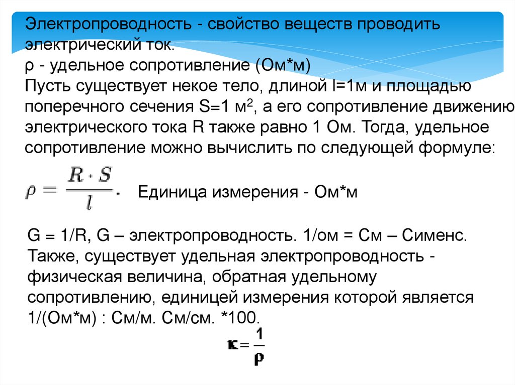 Также, существует удельная электропроводность физическая величина, обратная удельному