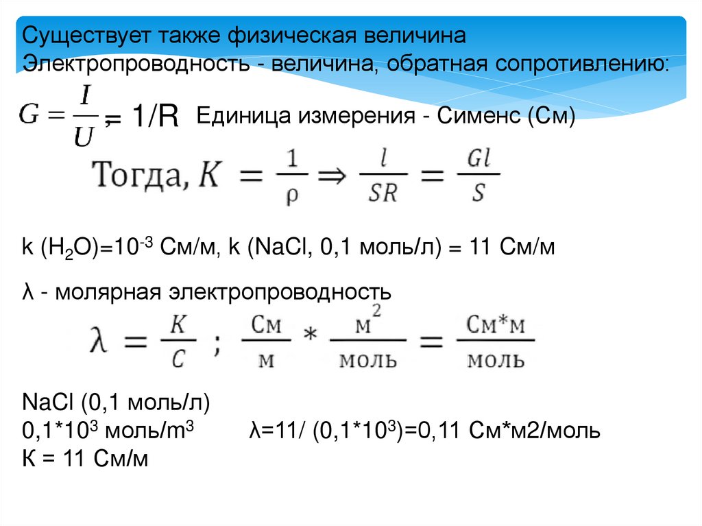 Cуществует также физическая величинаЭлектропроводность - величина, обратная сопротивлению: