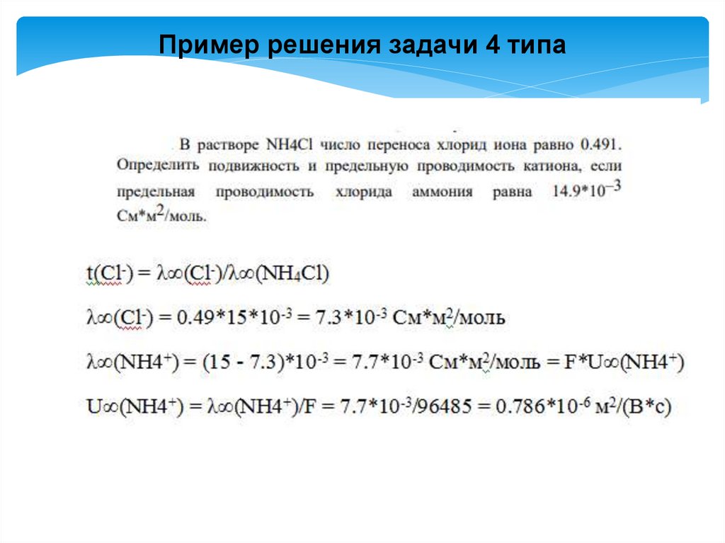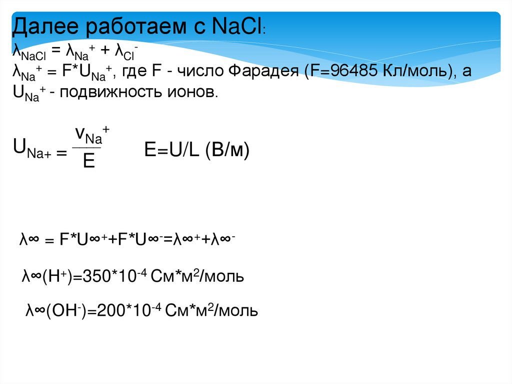 Далее работаем с NaCl:λNaCl = λNa+ + λClλNa+ = F*UNa+, где F - число Фарадея (F=96485 Кл/моль), а