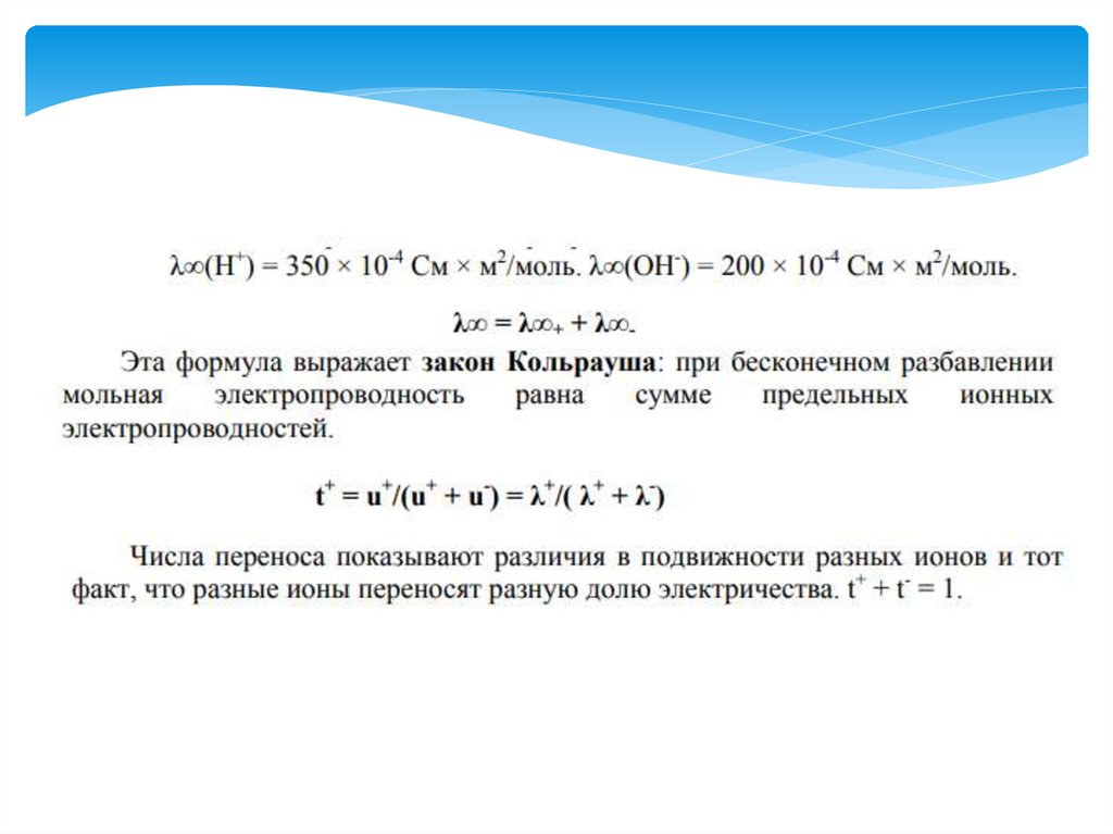 λ∞ = F*U∞++F*U∞-=λ∞++λ∞λ∞(H+)=350*10-4 Cм*м2/моль
