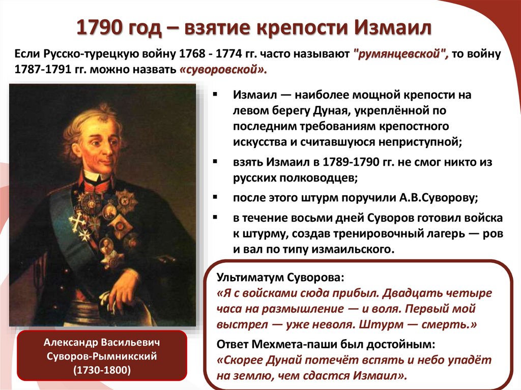 1790 год – взятие крепости ИзмаилЕсли Русско-турецкую войну 1768 - 1774 гг. часто называют "румянцевской", то войну
