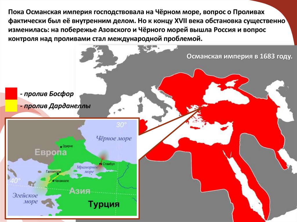Пока Османская империя господствовала на Чёрном море, вопрос о Проливахфактически был её внутренним делом. Но к концу XVII века обстановка существенно