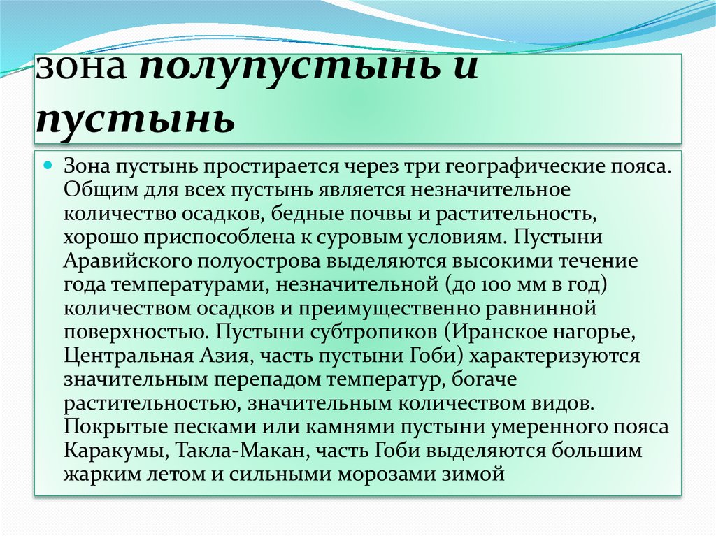 Зона пустынь простирается через три географические пояса.Общим для всех пустынь является незначительное