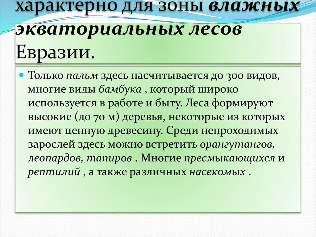24. Богатство флоры и фауны характерно для зоны влажных экваториальных лесов Евразии.
