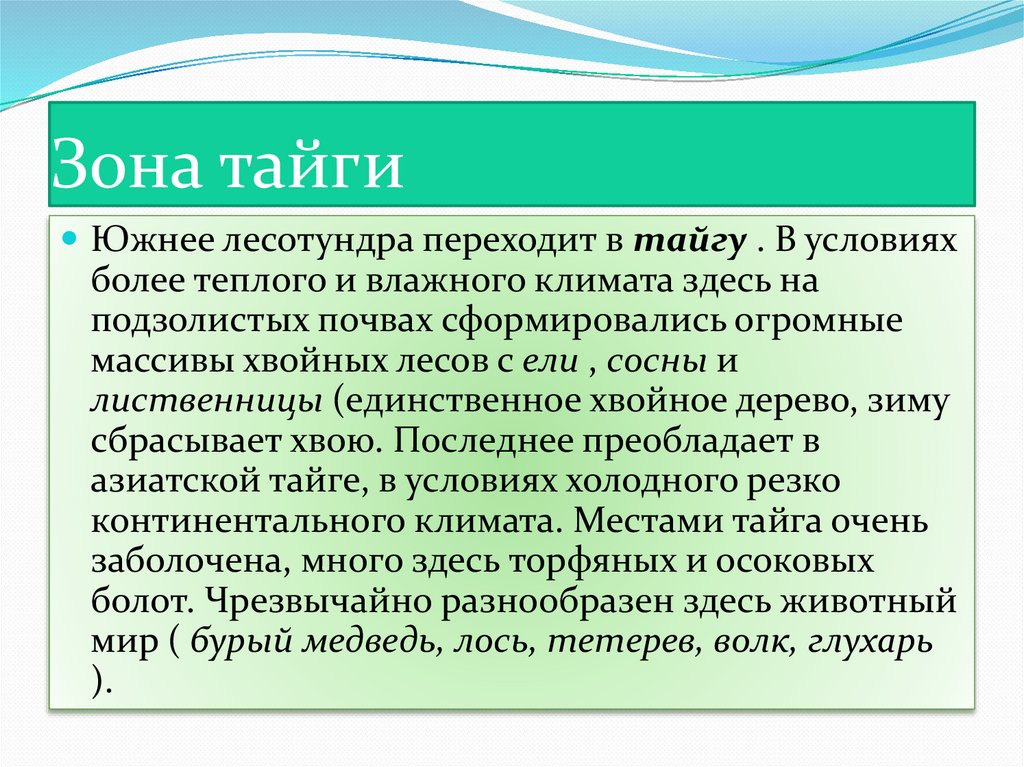 Южнее лесотундра переходит в тайгу . В условияхболее теплого и влажного климата здесь на