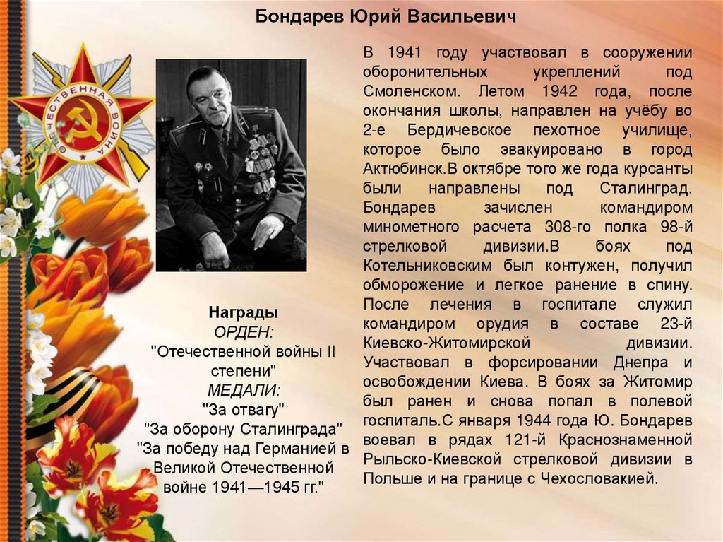 Бондарев Юрий ВасильевичВ 1941 году участвовал в сооружении
