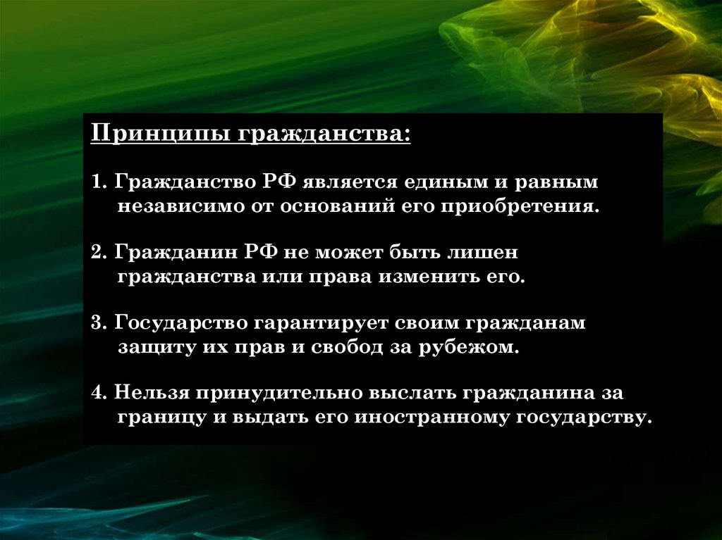 Принципы гражданства:1. Гражданство РФ является единым и равным