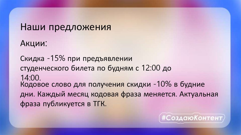 Кодовое слово для получения скидки -10% в будние