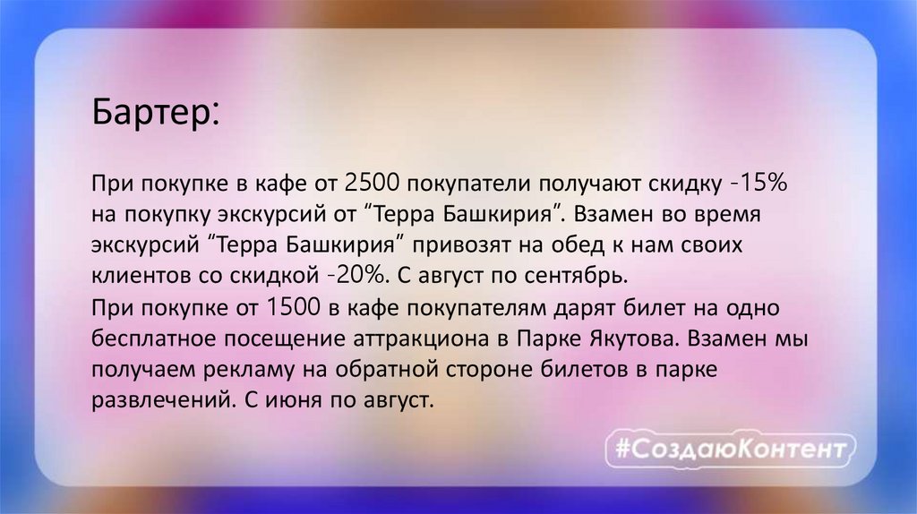 Бартер:При покупке в кафе от 2500 покупатели получают скидку -15%