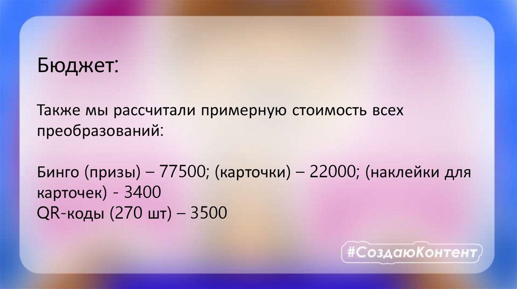 Бюджет:Также мы рассчитали примерную стоимость всех