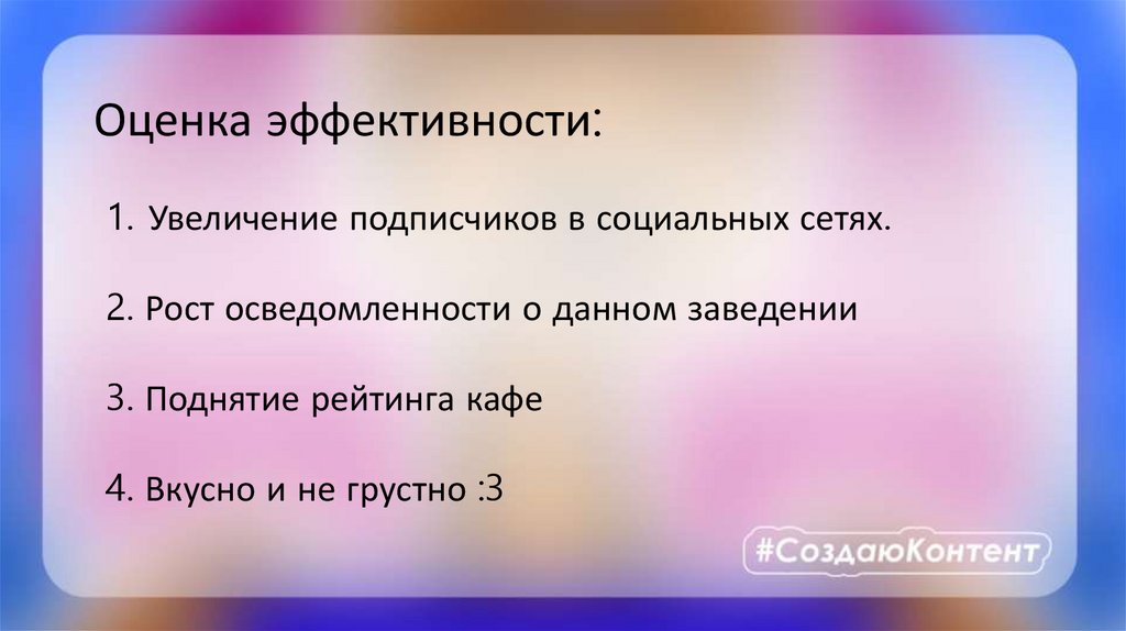 Оценка эффективности:1. Увеличение подписчиков в социальных сетях.