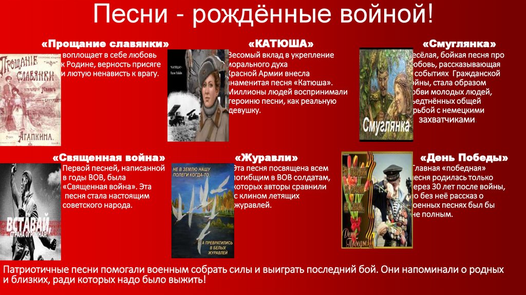Патриотичные песни помогали военным собрать силы и выиграть последний бой. Они напоминали о родных