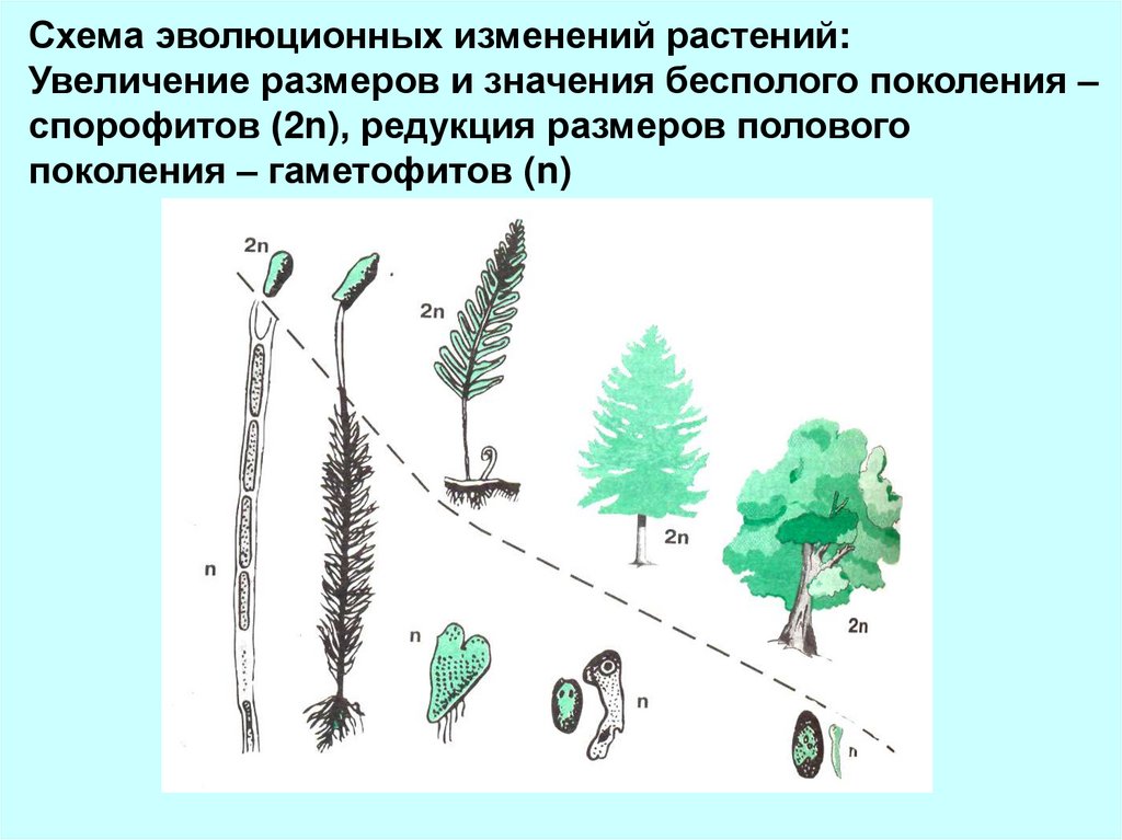 Схема эволюционных изменений растений:Увеличение размеров и значения бесполого поколения –