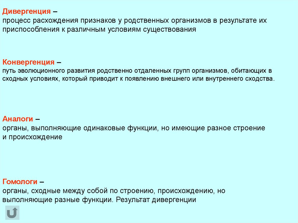 Дивергенция –процесс расхождения признаков у родственных организмов в результате их