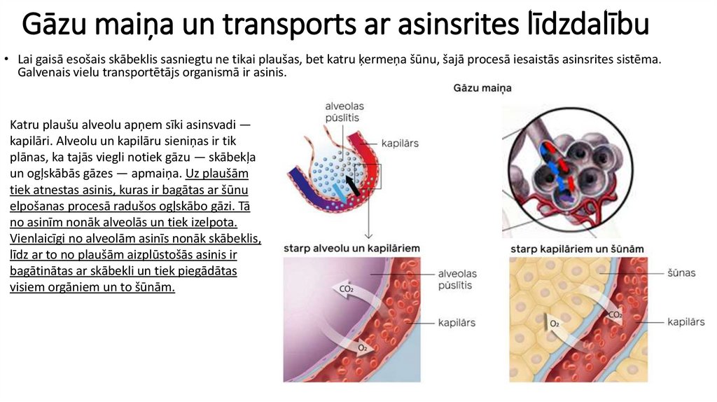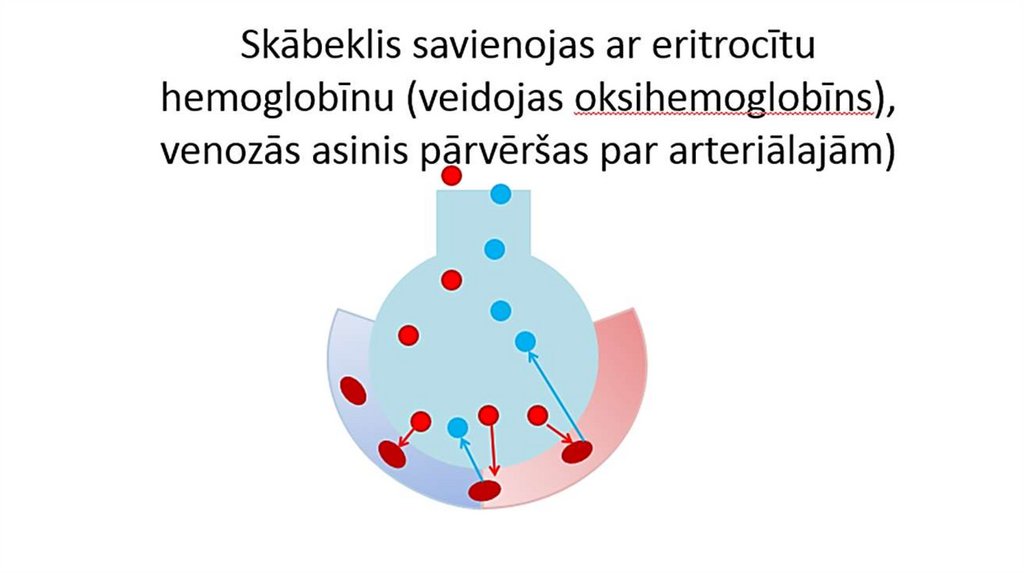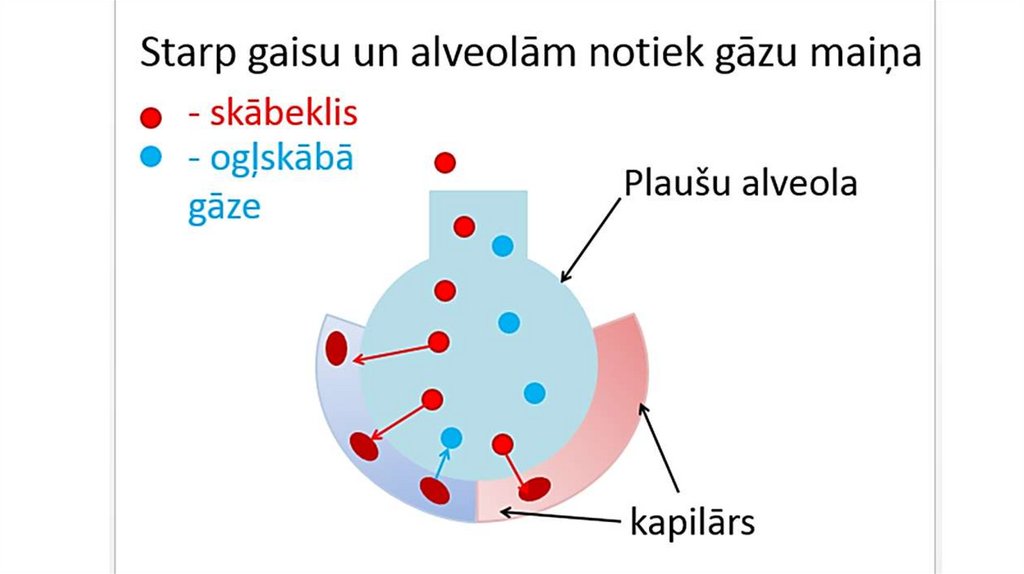 • Skābeklis no alveolām nokļūst asiņu eritrocītos, bet