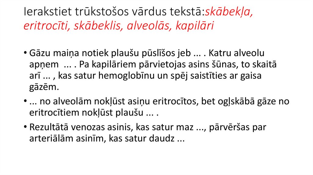 16. Ierakstiet trūkstošos vārdus tekstā:skābekļa, eritrocīti, skābeklis, alveolās, kapilāri