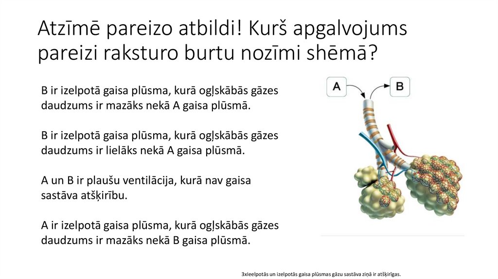 B ir izelpotā gaisa plūsma, kurā ogļskābās gāzesdaudzums ir mazāks nekā A gaisa plūsmā.