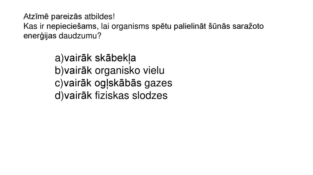 24. Atzīmē pareizās atbildes! Kas ir nepieciešams, lai organisms spētu palielināt šūnās saražoto enerģijas daudzumu?