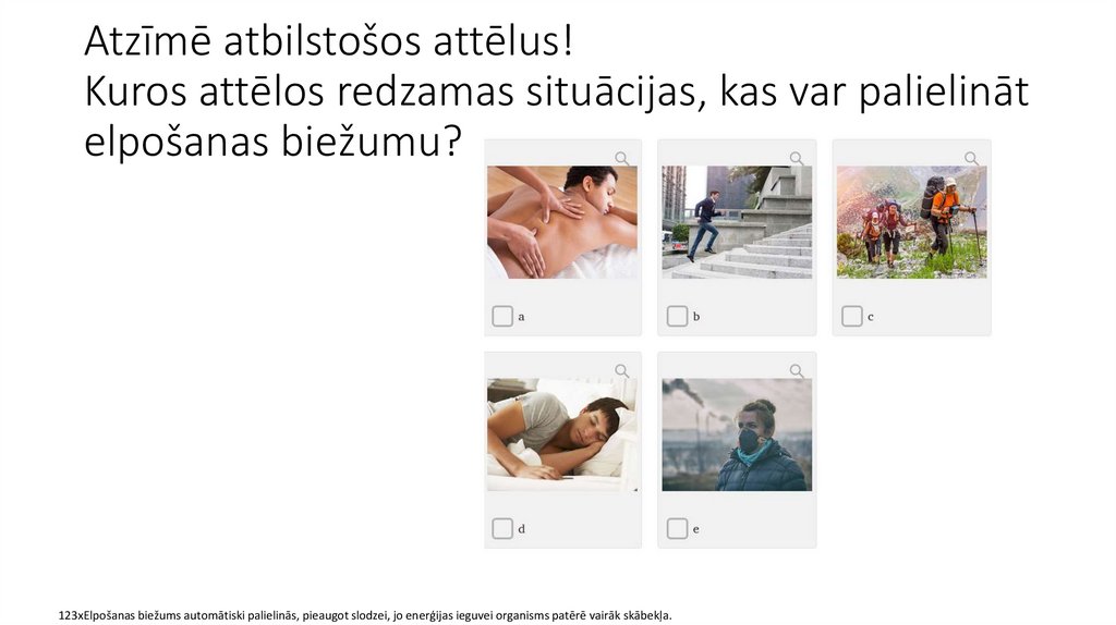28. Atzīmē atbilstošos attēlus! Kuros attēlos redzamas situācijas, kas var palielināt elpošanas biežumu?