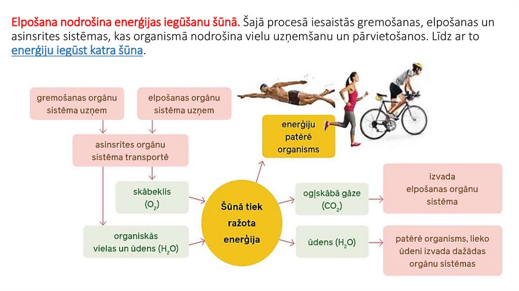 4. Elpošana nodrošina enerģijas iegūšanu šūnā. Šajā procesā iesaistās gremošanas, elpošanas un asinsrites sistēmas, kas organismā