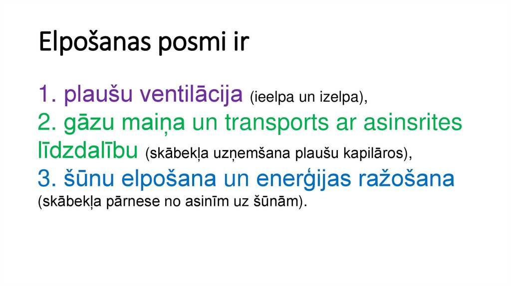 1. plaušu ventilācija (ieelpa un izelpa),2. gāzu maiņa un transports ar asinsrites