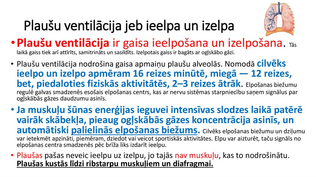 • Plaušu ventilācija ir gaisa ieelpošana un izelpošana. Tāslaikā gaiss tiek arī attīrīts, samitrināts un sasildīts. Izelpotais gaiss ir bagāts ar ogļskābo gāzi.