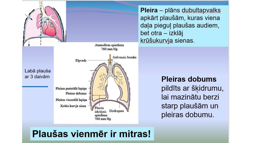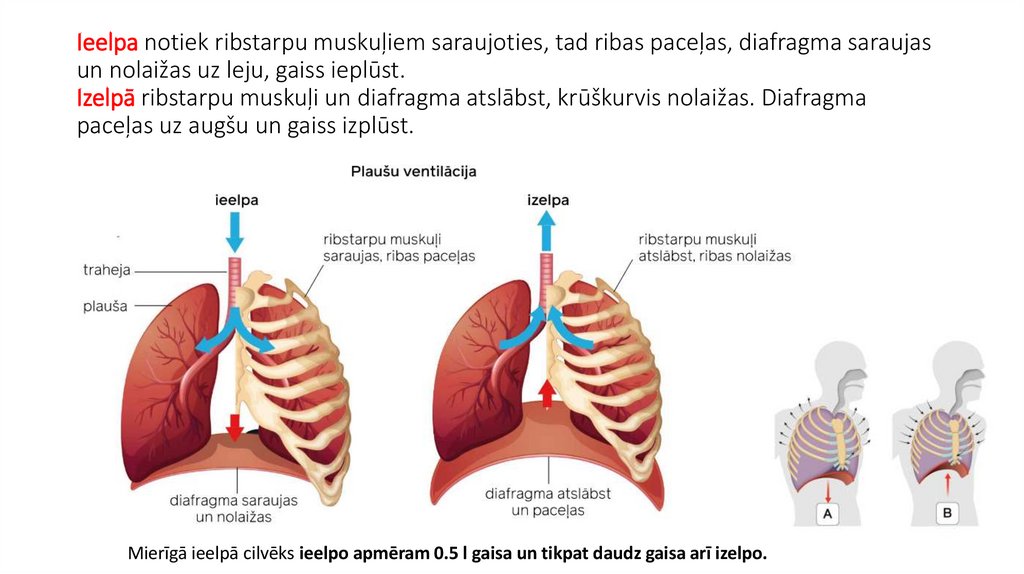 8. Ieelpa notiek ribstarpu muskuļiem saraujoties, tad ribas paceļas, diafragma saraujas un nolaižas uz leju, gaiss ieplūst. Izelpā