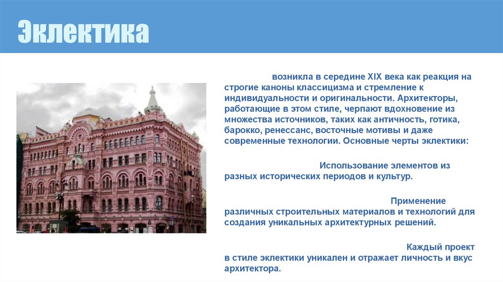 ЭклектикаЭклектика возникла в середине XIX века как реакция на