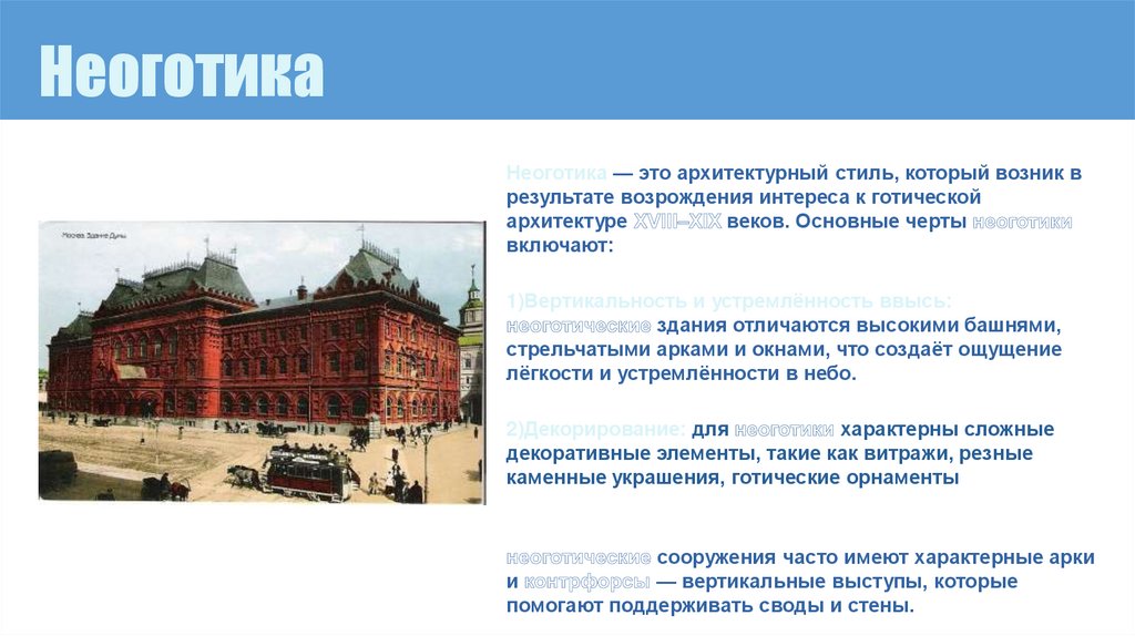 НеоготикаНеоготика — это архитектурный стиль, который возник в