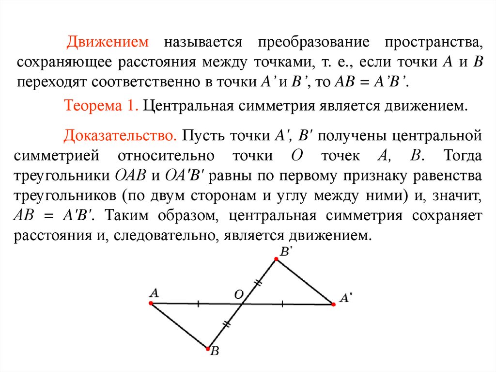Движением называется преобразование пространства,сохраняющее расстояния между точками, т. е., если точки A и B