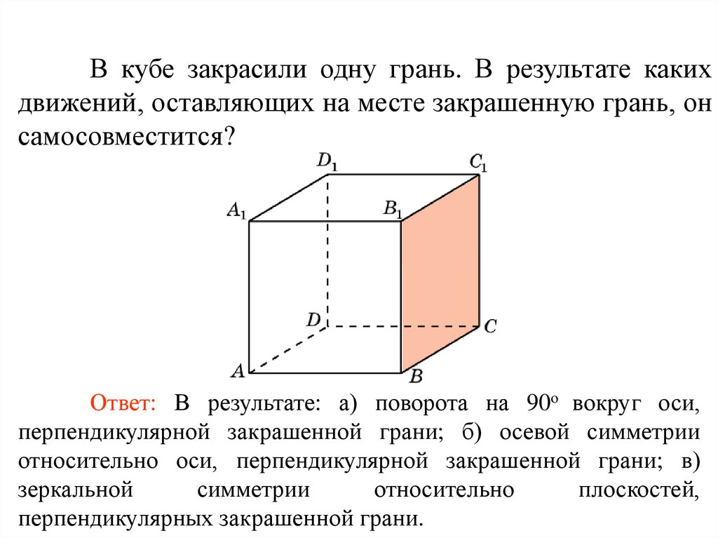 В кубе закрасили одну грань. В результате какихдвижений, оставляющих на месте закрашенную грань, он