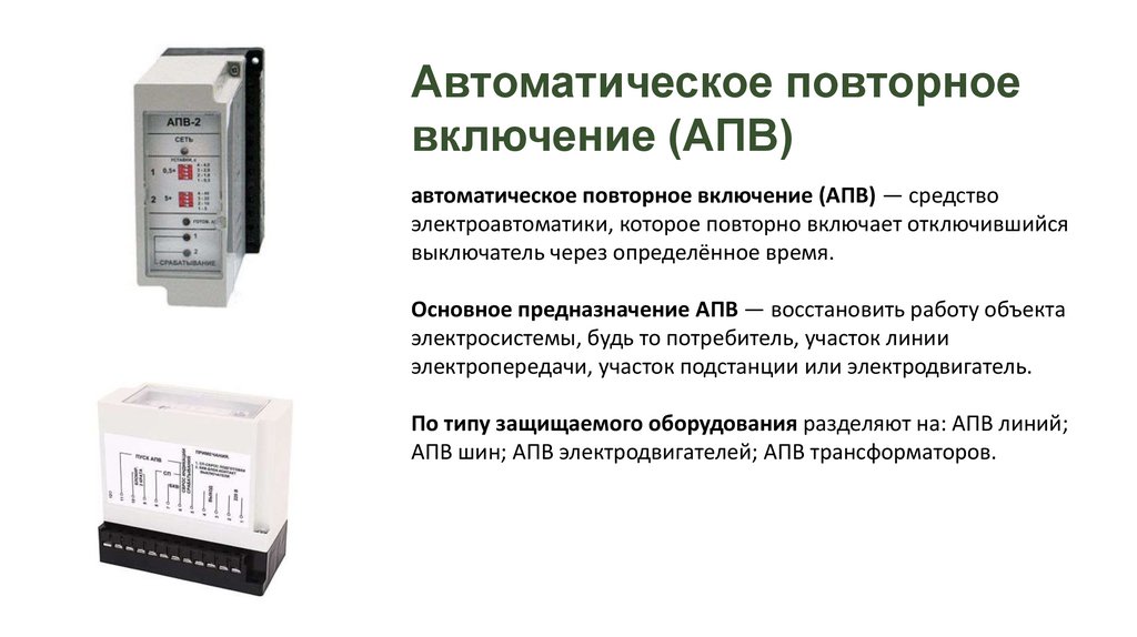 АПВ шин; АПВ электродвигателей; АПВ трансформаторов.