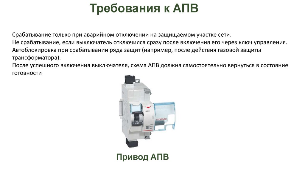 Требования к АПВСрабатывание только при аварийном отключении на защищаемом участке сети.