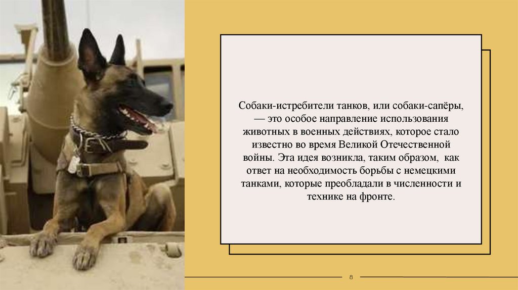 Собаки-истребители танков, или собаки-сапёры,— это особое направление использования