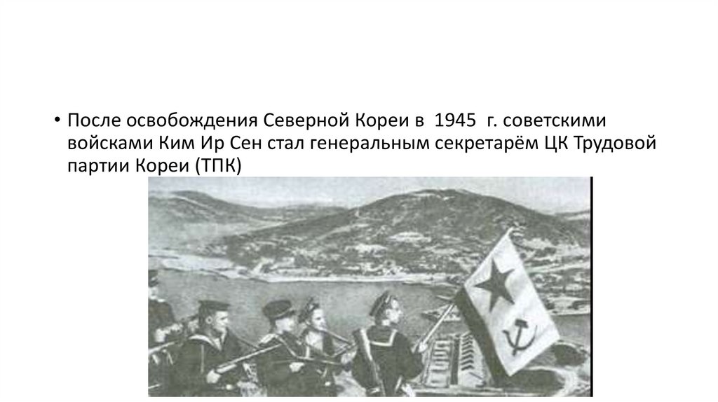 • После освобождения Северной Кореи в 1945 г. советскимивойсками Ким Ир Сен стал генеральным секретарём ЦК Трудовой