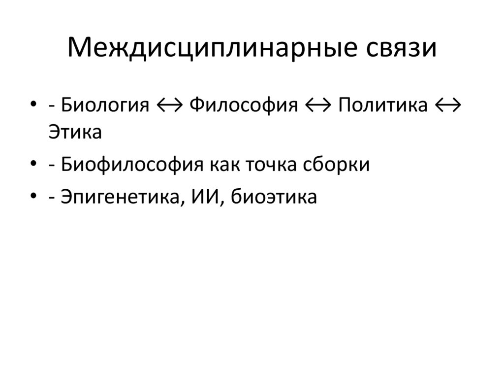 Междисциплинарные связи• - Биология ↔ Философия ↔ Политика ↔