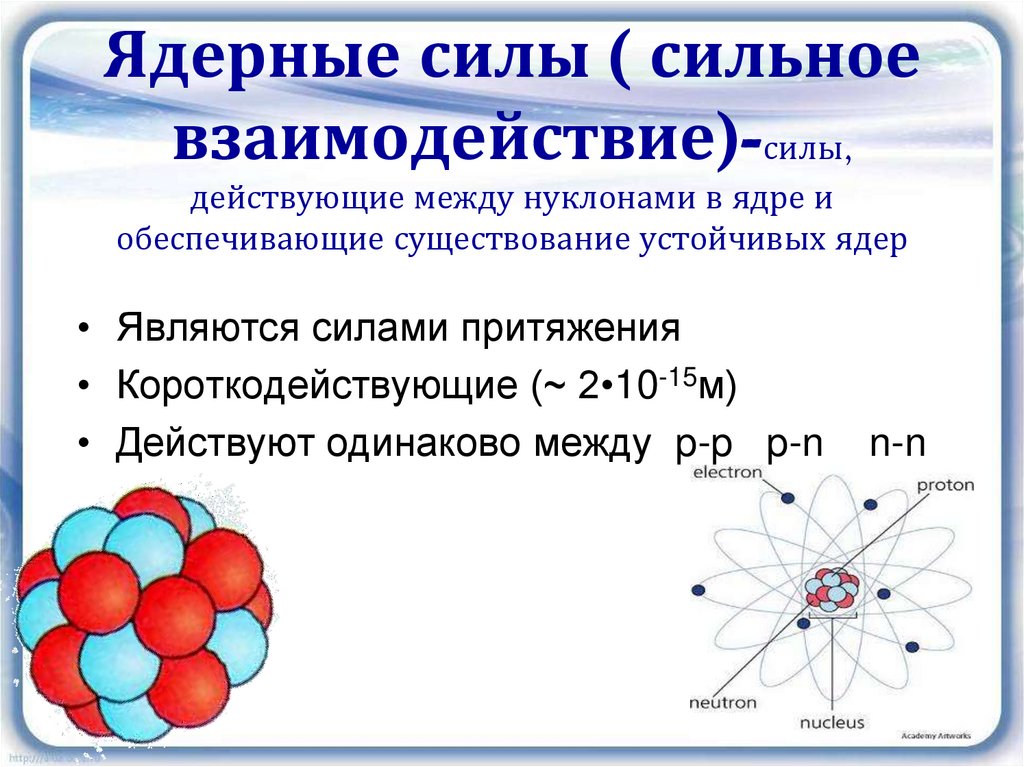 3. Ядерные силы ( сильное взаимодействие)-силы, действующие между нуклонами в ядре и обеспечивающие существование устойчивых ядер