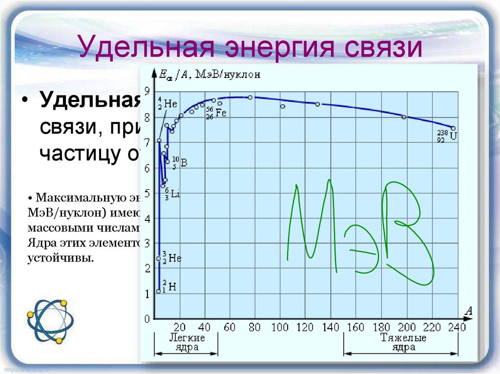 • Удельная энергия связи (Еуд) – энергиясвязи, приходящаяся на одну ядерную